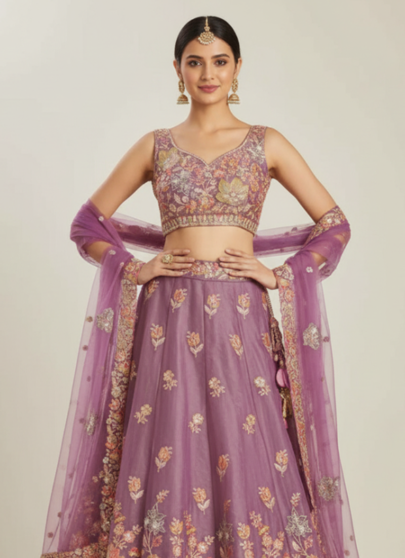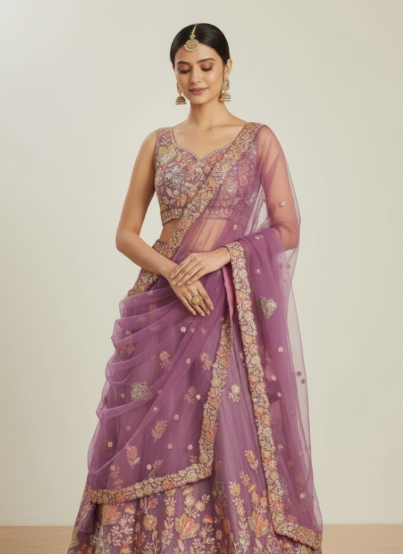 - This lavender lehenga is made of organza fabric garnished with full thread and sequence embroidery work.