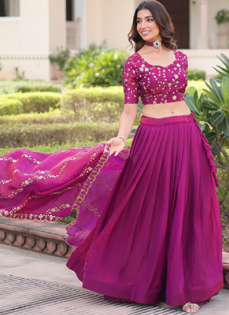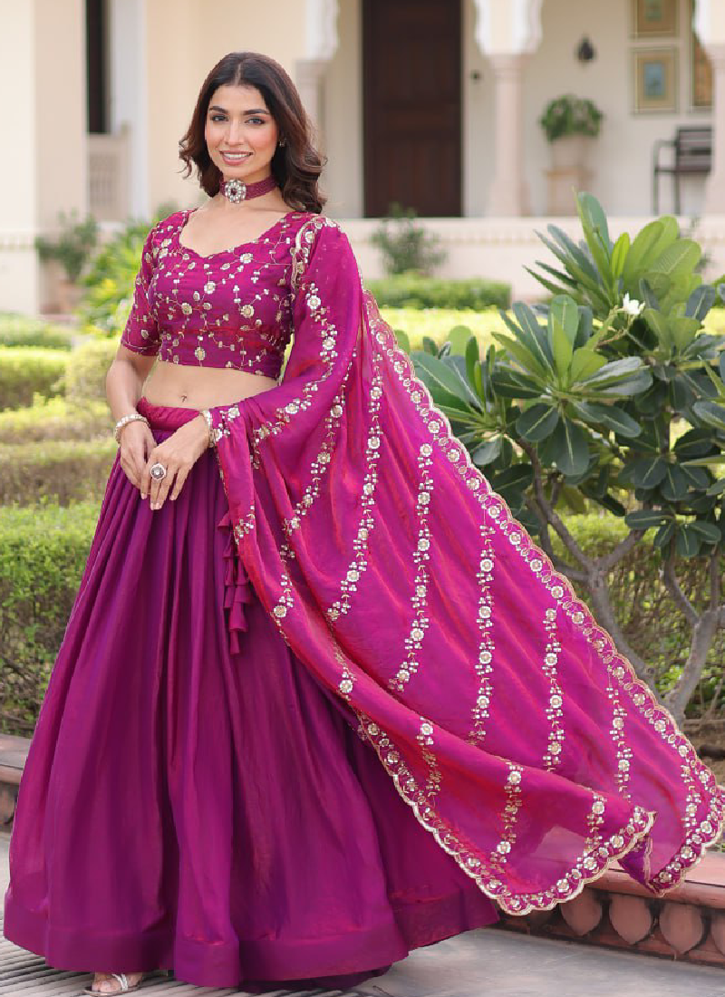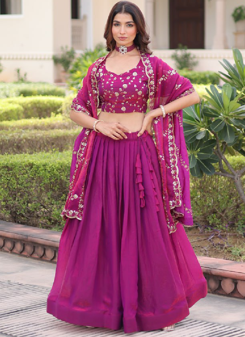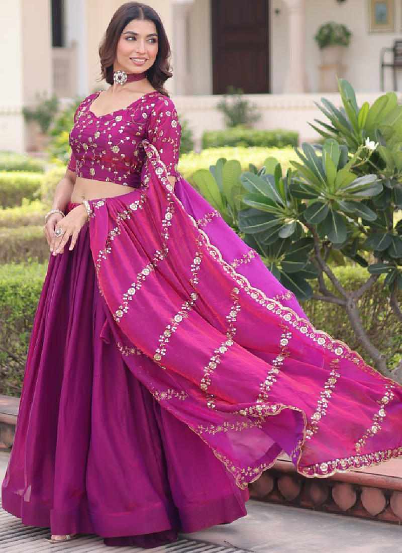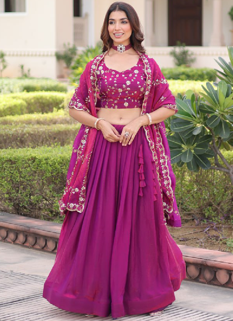 - This pink fendi silk lehenga choli brings an elegant fusion of luxury fabric and heavy designer embroidery, perfect for weddings and festive celebrations.