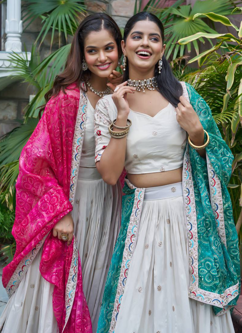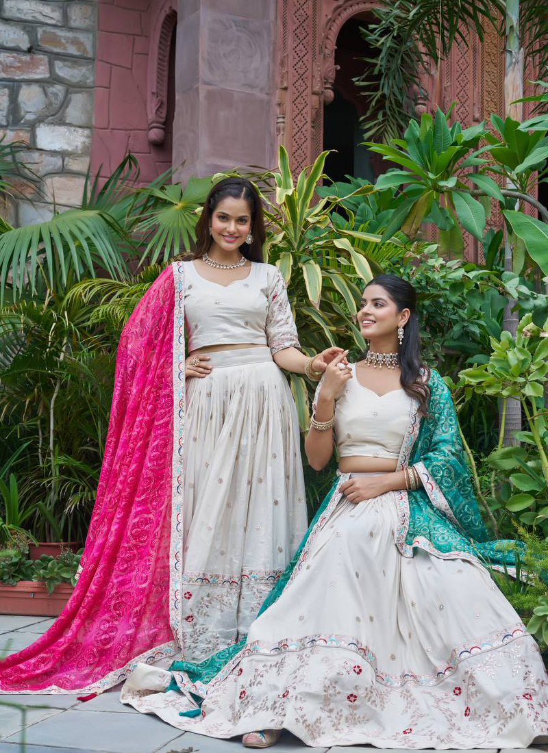 - Embrace royal charm with this off-white tissue silk wedding lehenga choli, designed for timeless elegance.