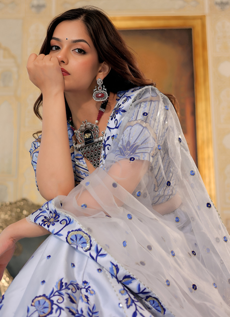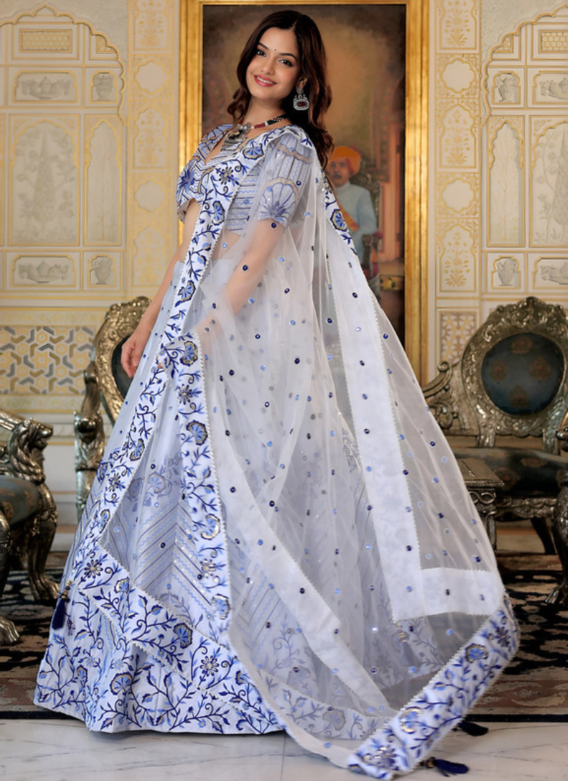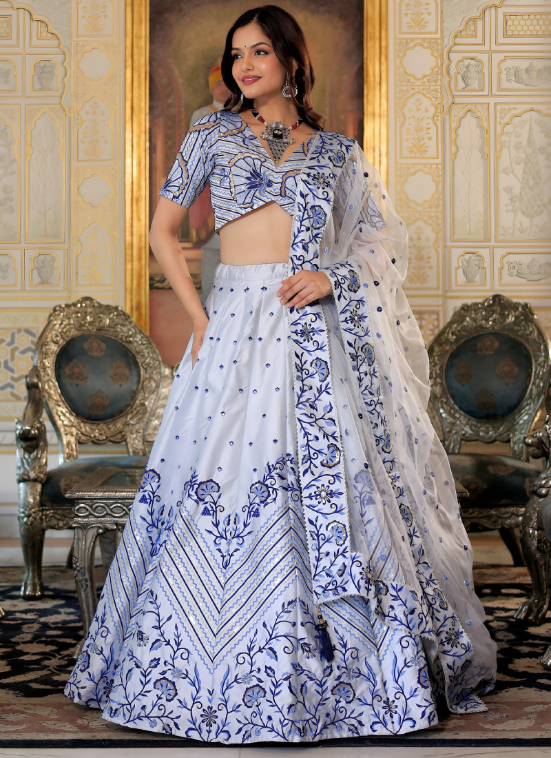- Floral embroidered thread work white satin lehenga choli for party functions, weddings, festivals, and special functions.