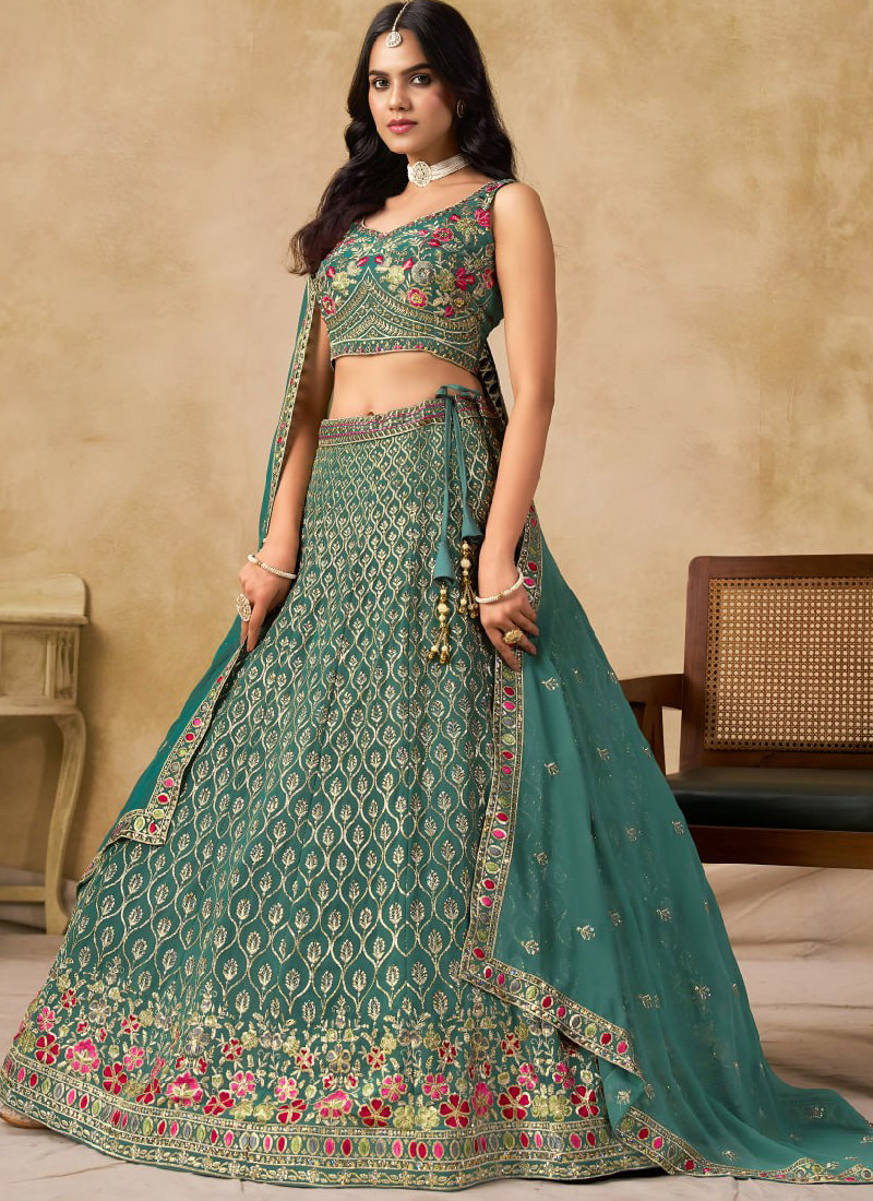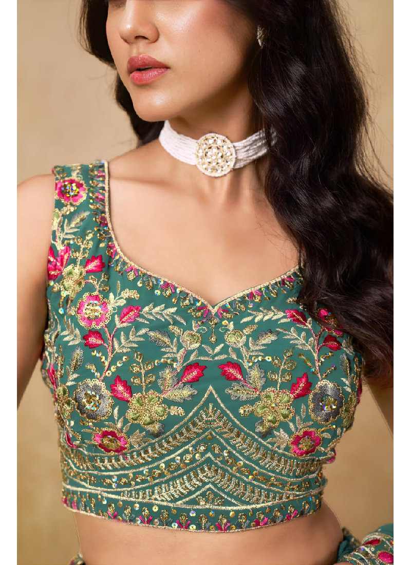 - This luxurious green wedding lehenga choli arrives in premium georgette, crafted to sway like a royal breeze at every step.