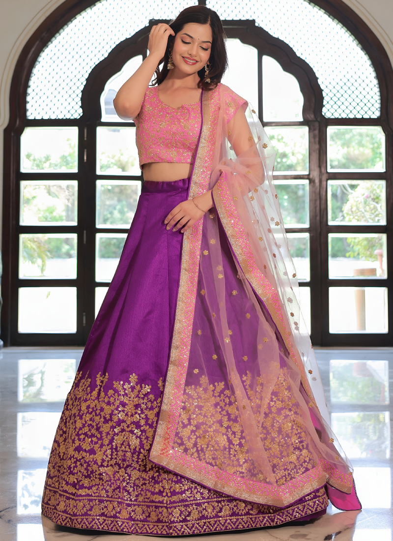 - Mulberry silk zari embroidered work purple wedding wear lehenga choli with dupatta at an affordable price.