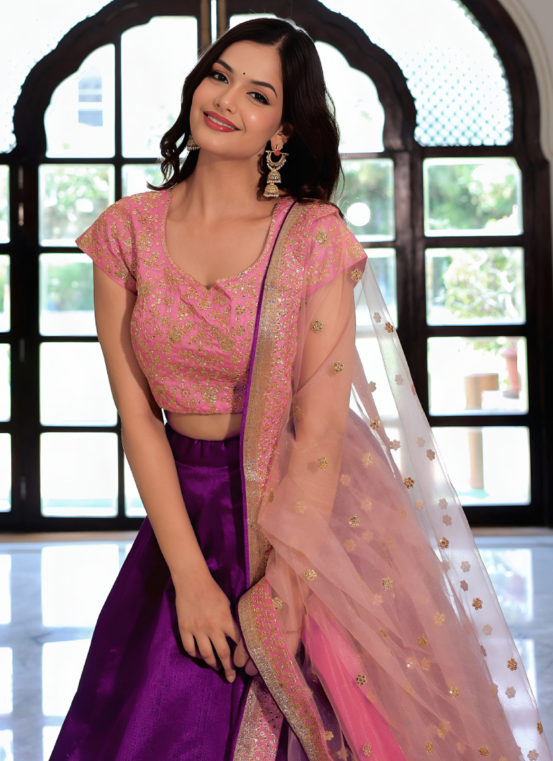 - The attractive mulberry silk purple lehenga and peach blouse embroidery work outfit is perfect for all occasions when you want to shine in front of others.