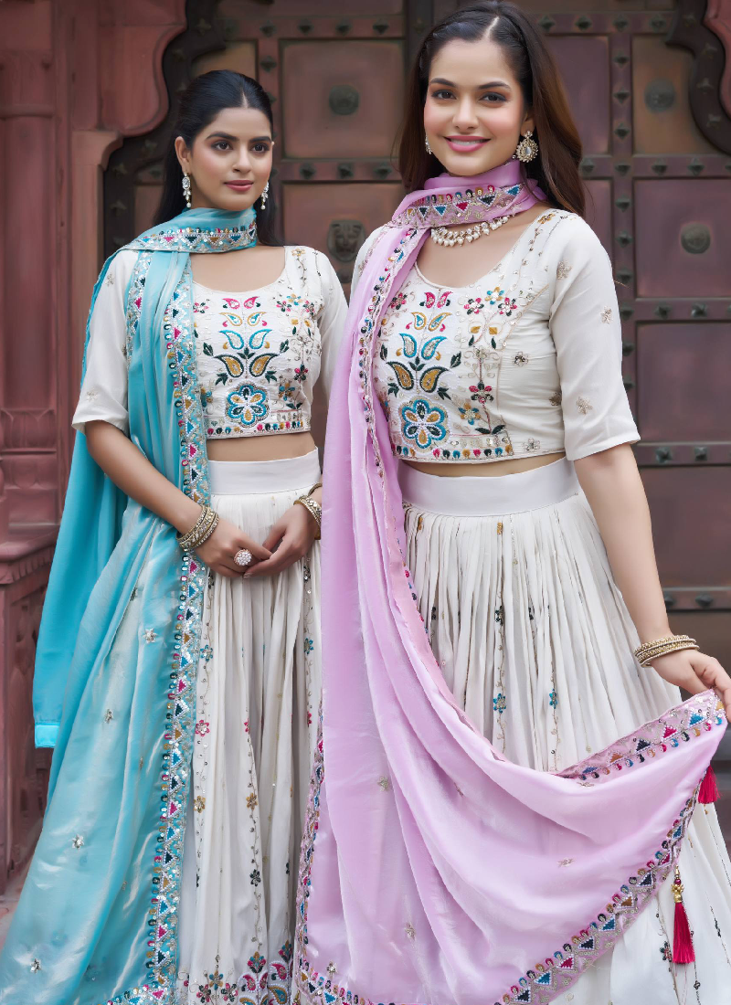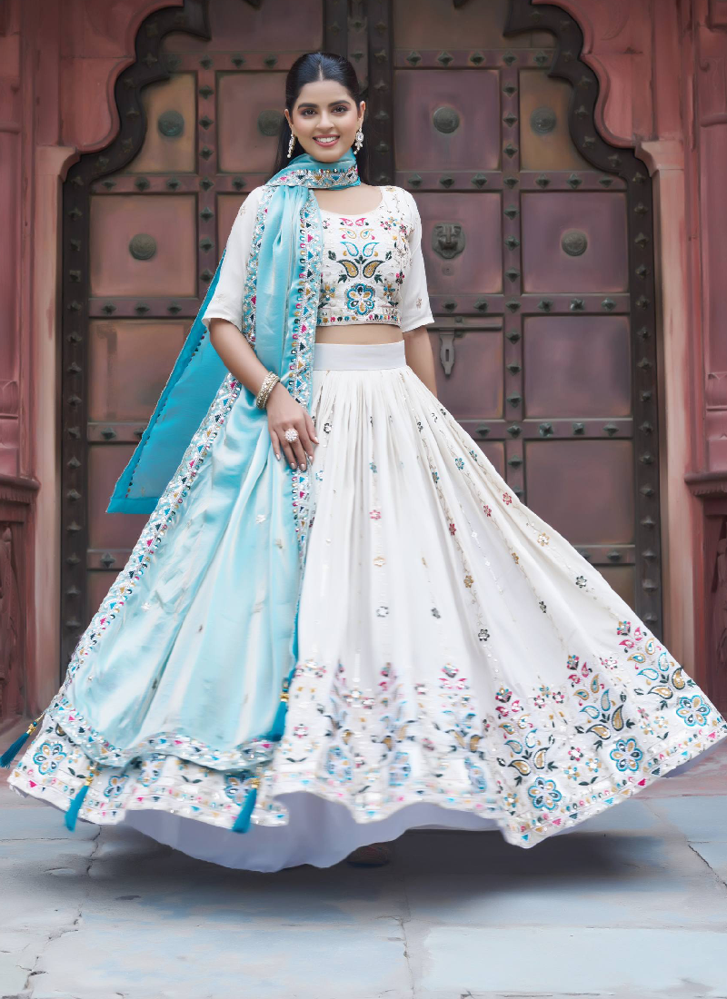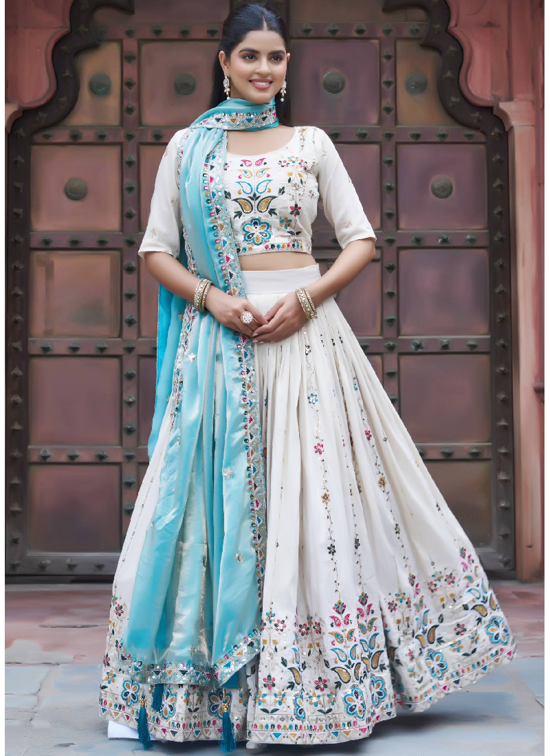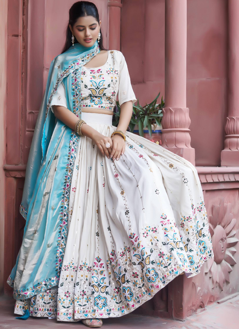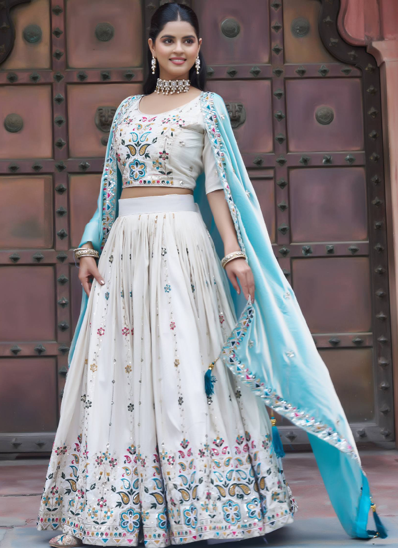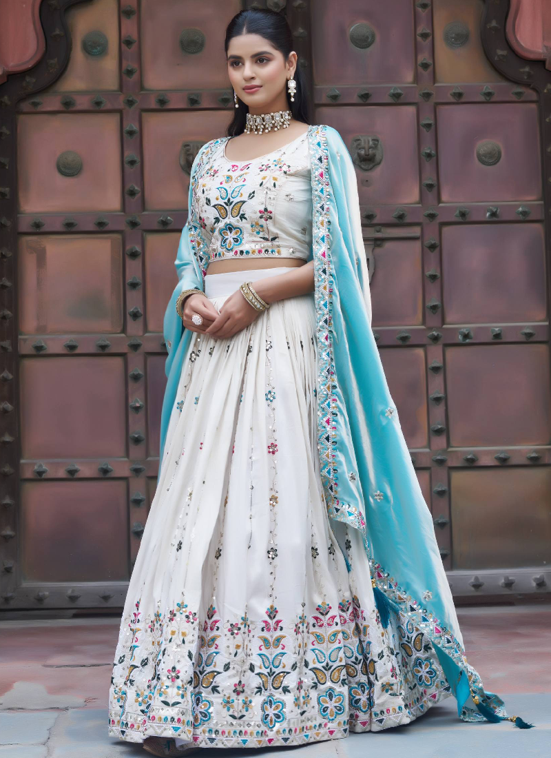 - Exude elegance and grace with this multi-thread embroidered off-white tissue silk lehenga choli set, designed to make you stand out at weddings, receptions, and festive occasions.