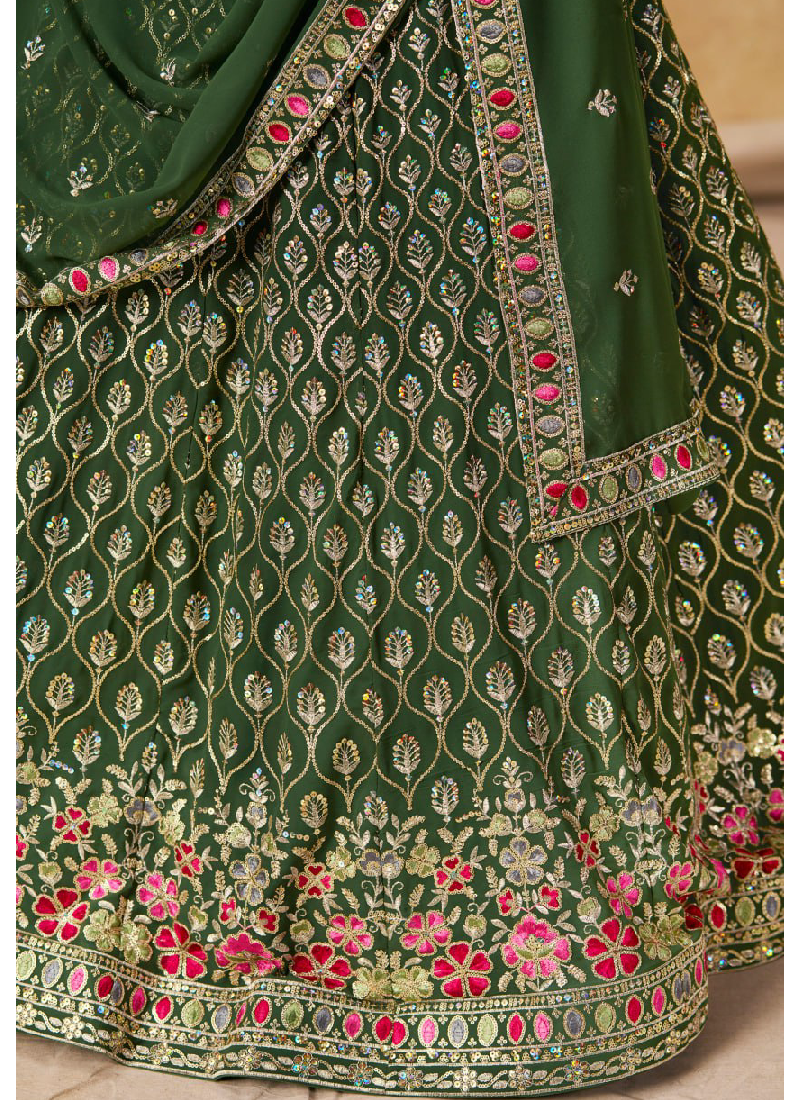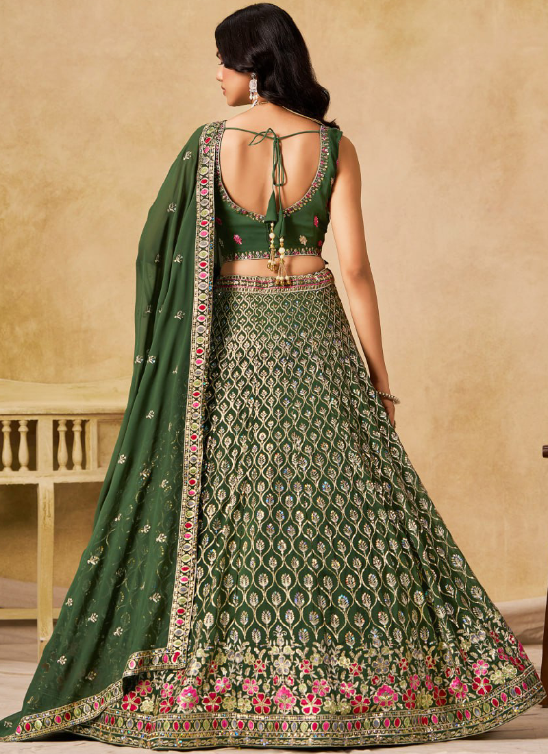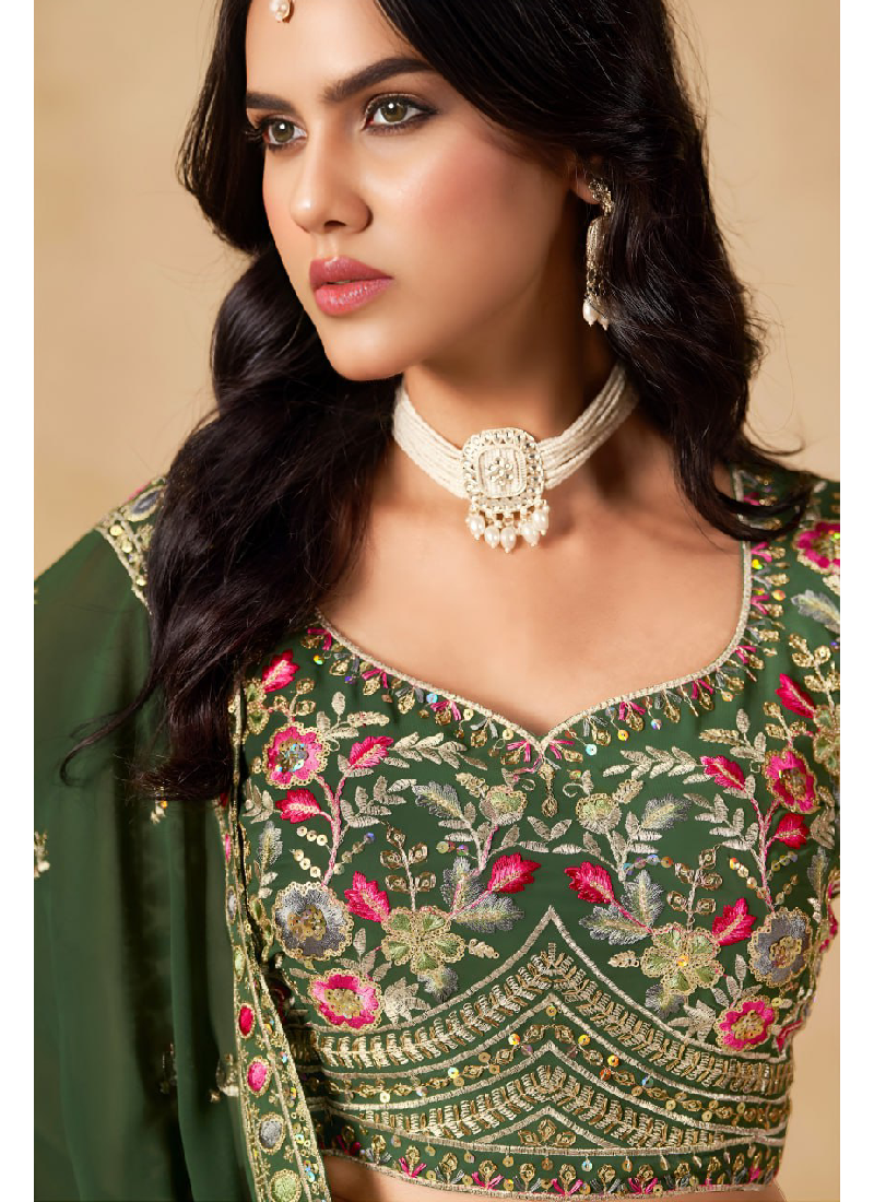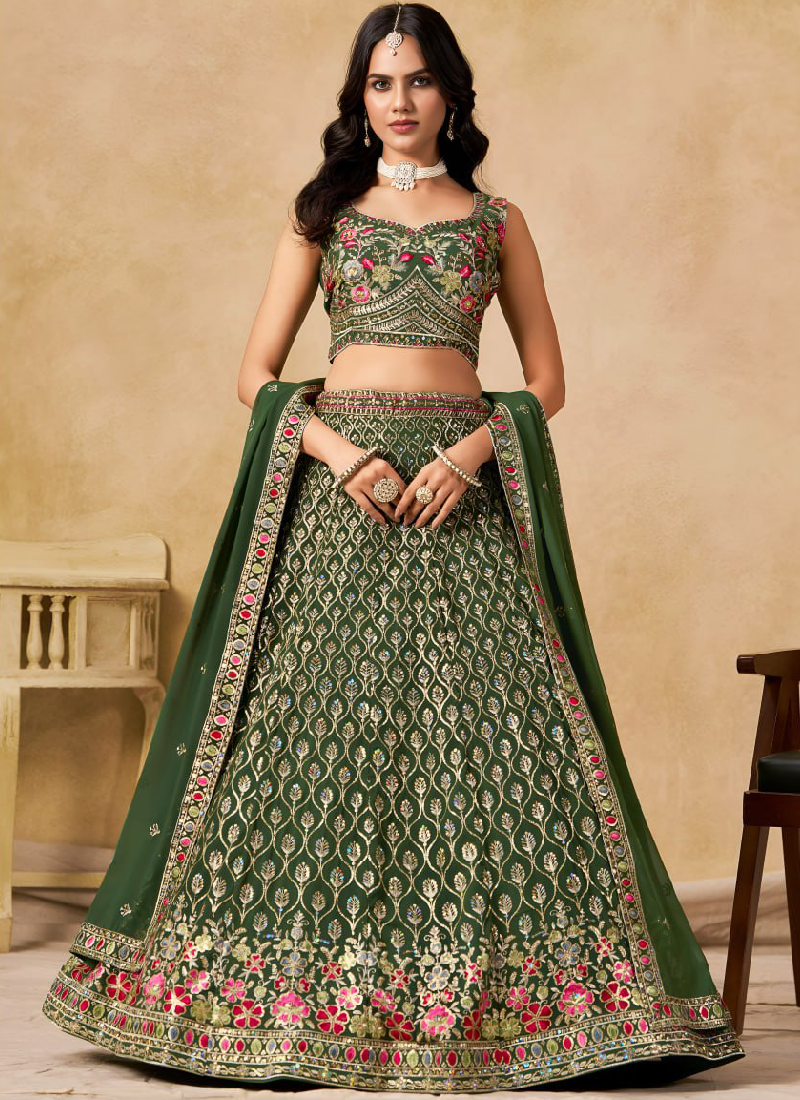 - This mehndi green georgette lehenga features luxurious sequins, zari, resham, and badla embroidery, giving it a premium festive shine.