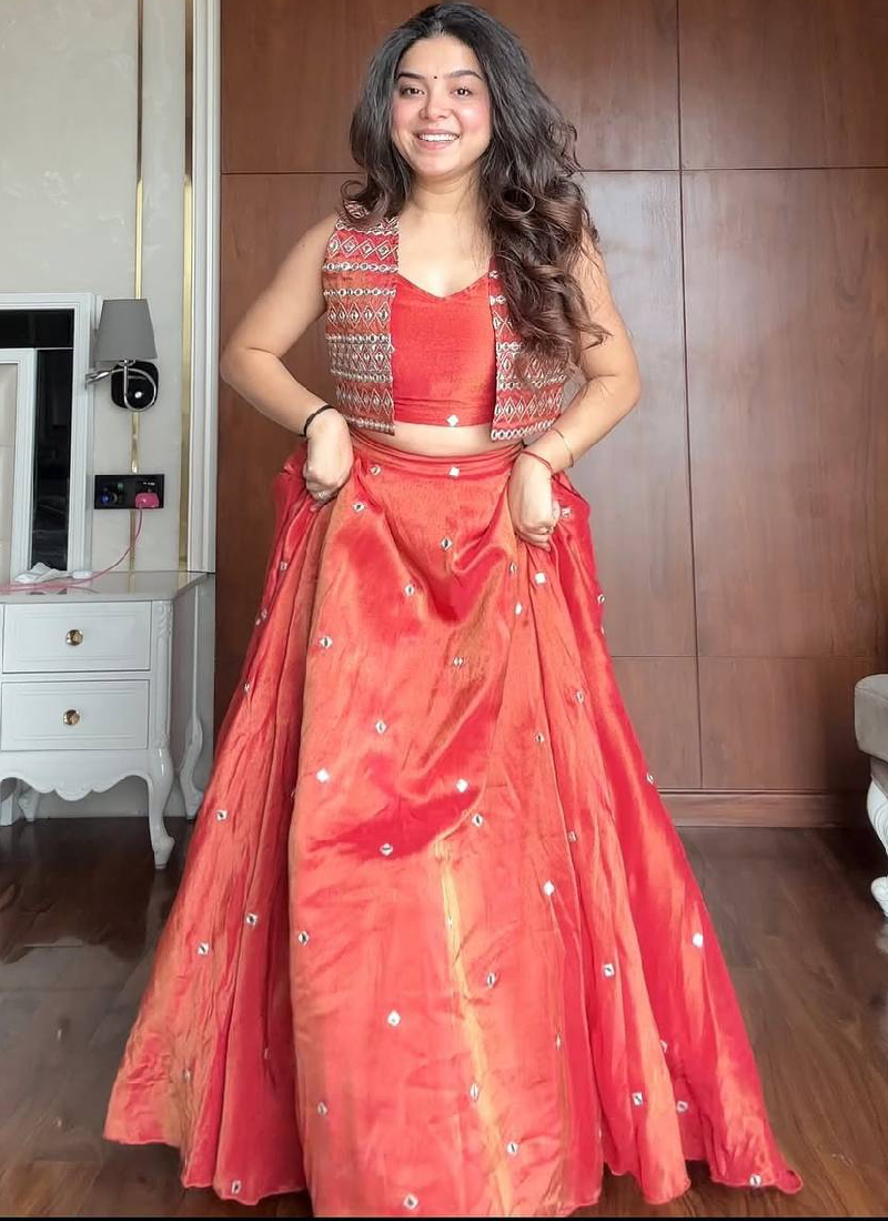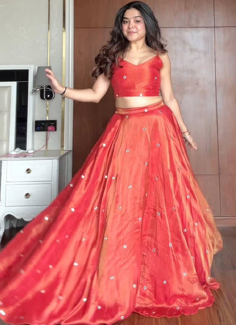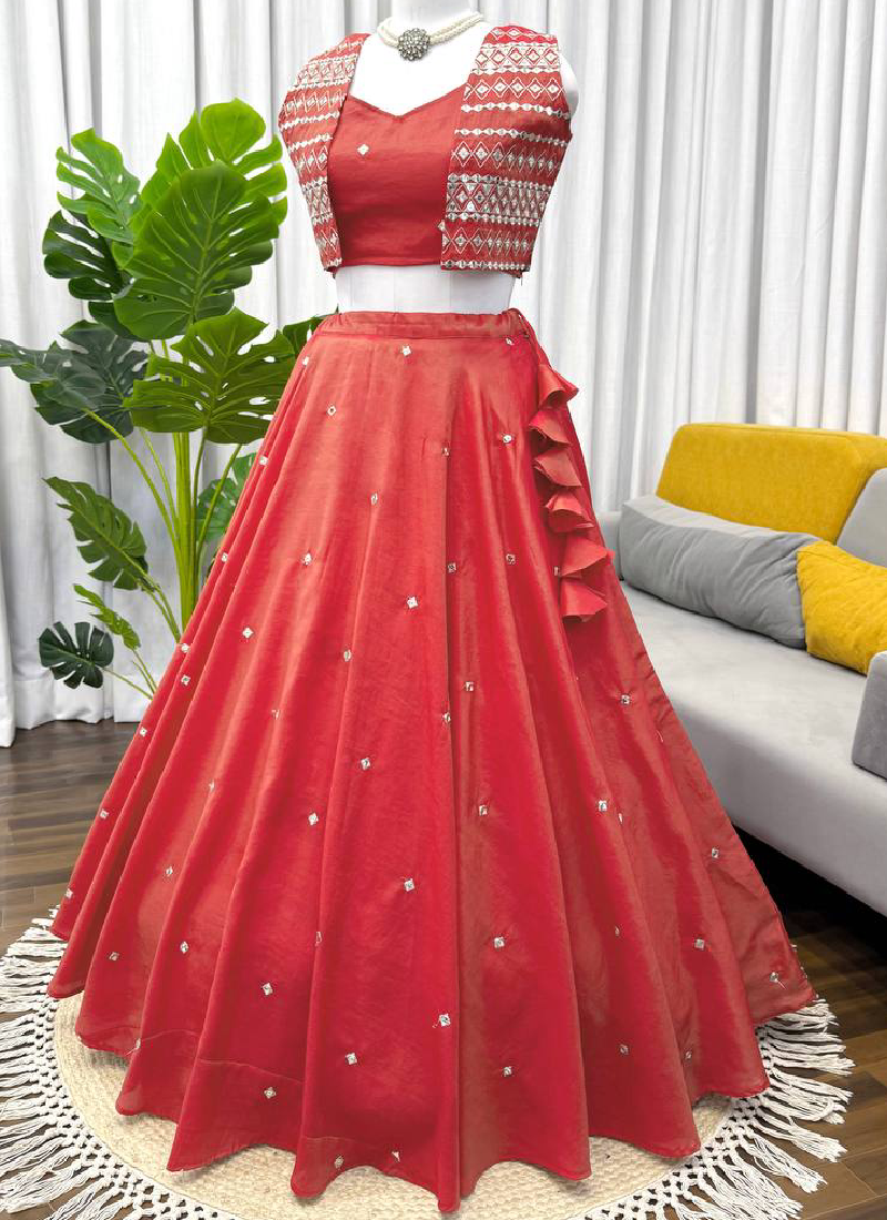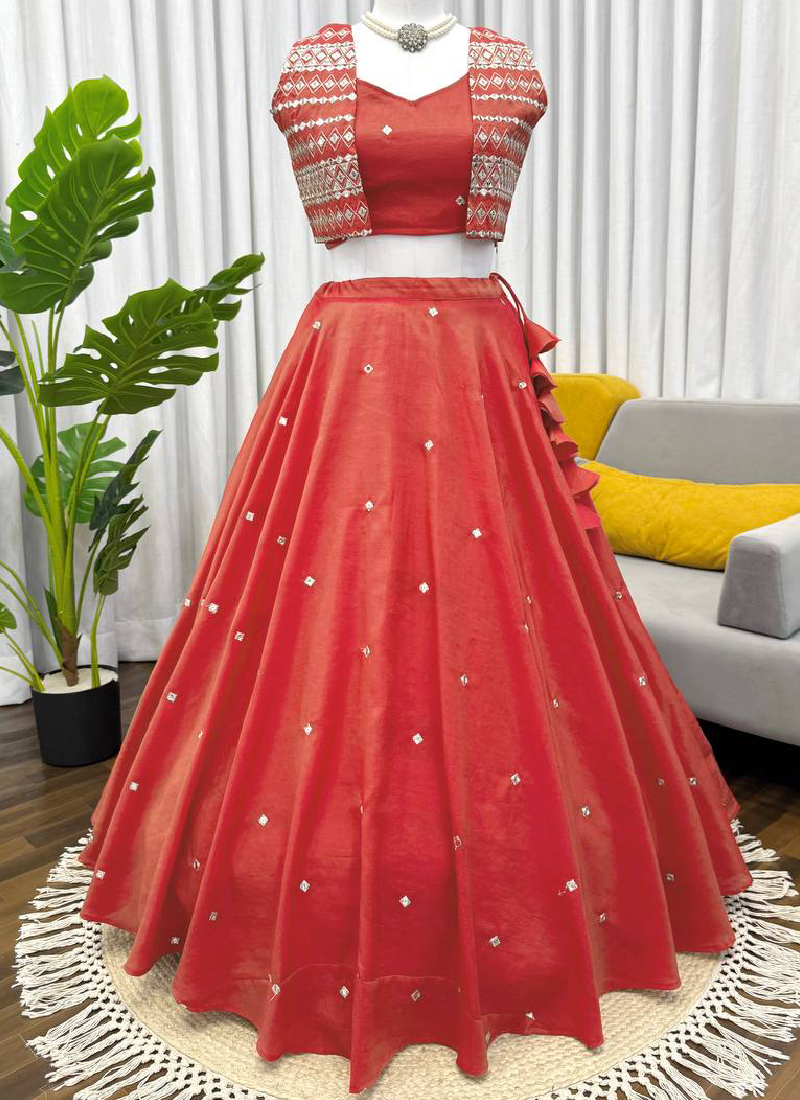 - Step into timeless elegance with this captivating shimmer silk orange lehenga set, designed to make you stand out at every festive celebration.