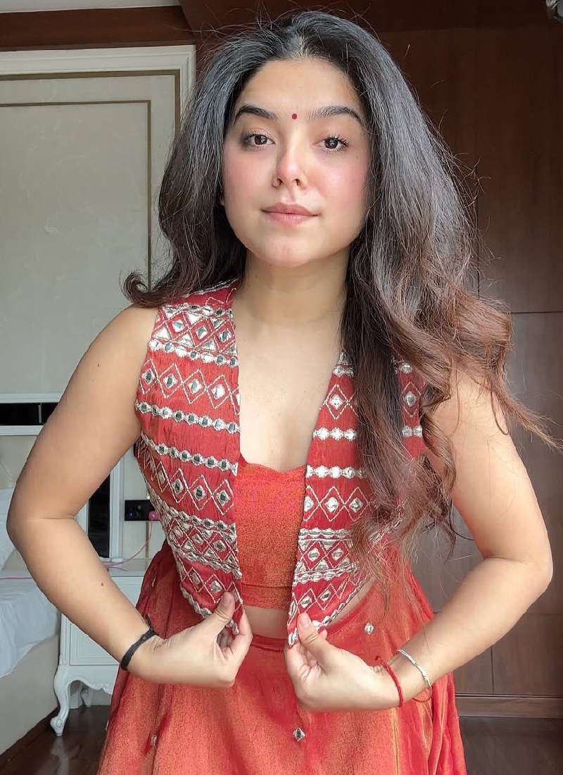 - The look is elevated with a stylish embroidered koti jacket, adding a contemporary twist to traditional charm.
