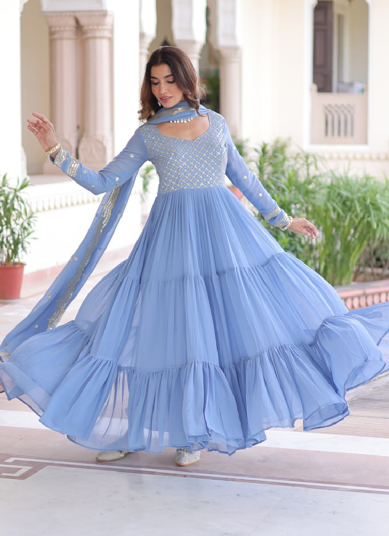 Sky Blue Faux Georgette Sequence Embroidered Three Layer Frill Gown