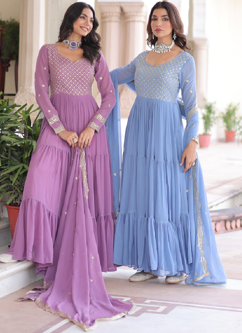 - This luxurious gown set is crafted from premium faux georgette fabric, offering a rich and graceful appearance.
