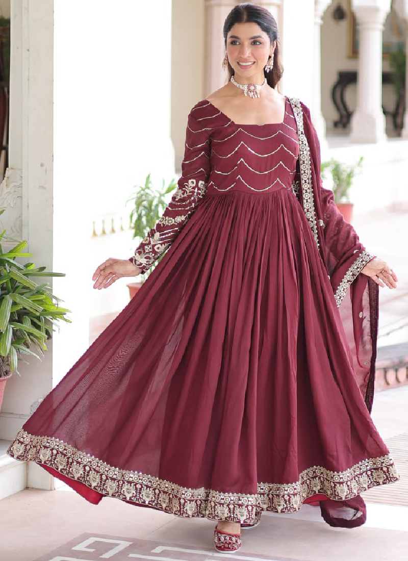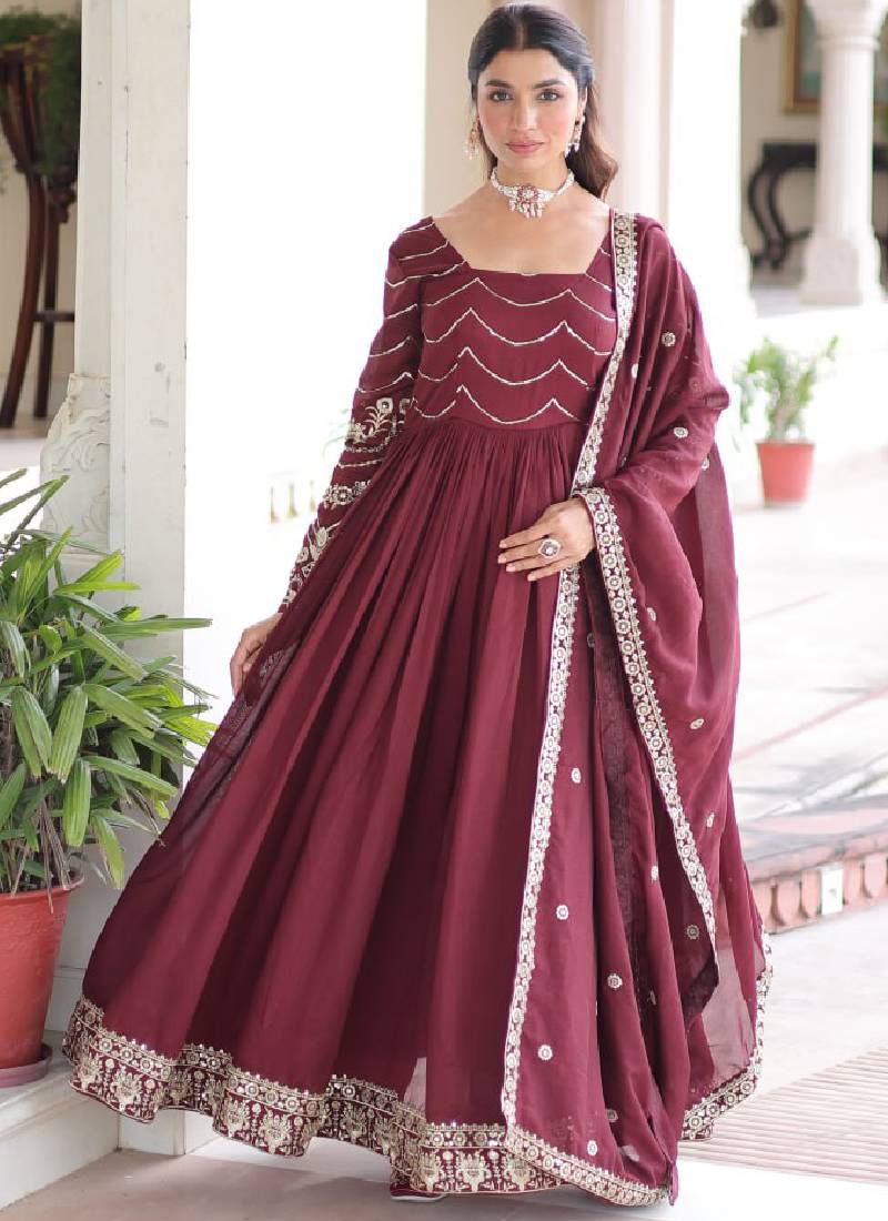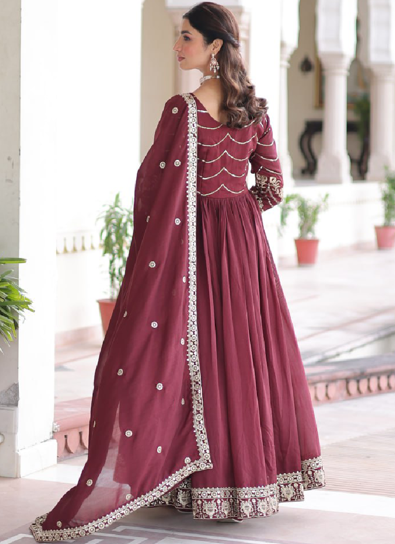 - Step into festive elegance with this stunning maroon vichitra silk anarkali gown, beautifully crafted with rich sequence embroidered work for a luxurious, premium look.