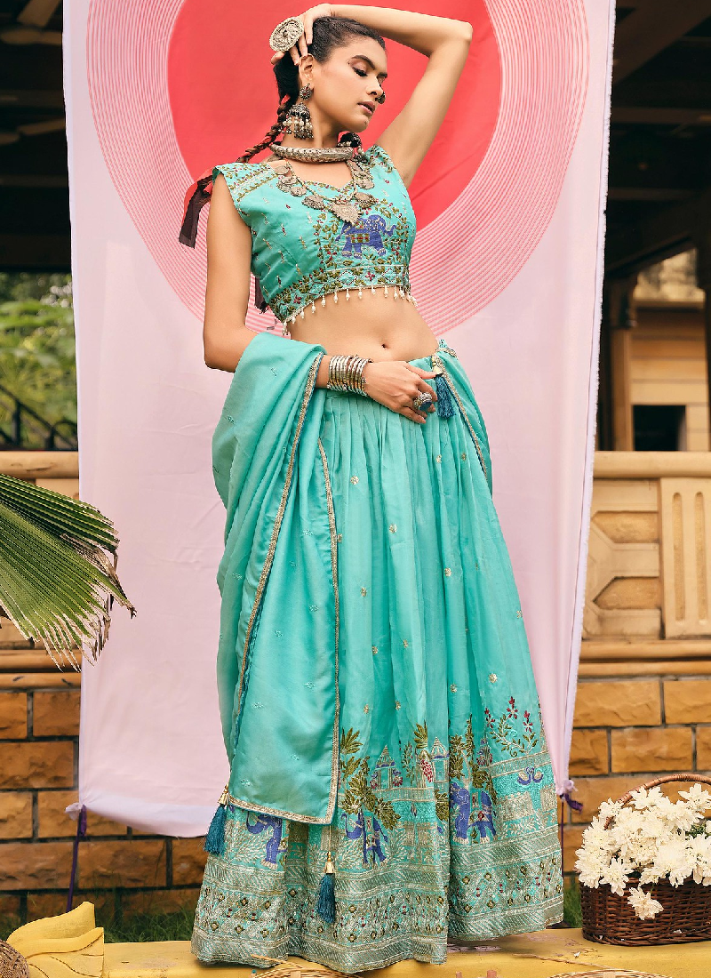 Zari Embroidery Work Shimmer Silk Sky Blue Lehenga Choli For Women